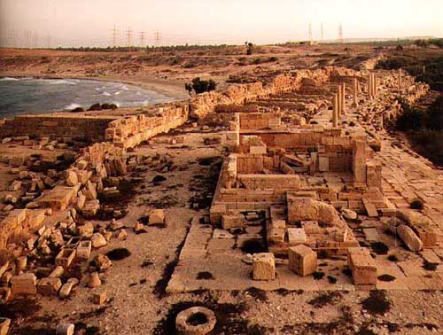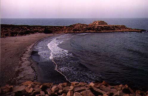 | The site of the original Phoenician settlement was probably on the promontory protecting the harbour. The harbour was reconstructed as part of the aggrandisement of Lepcis Magna under Emperor L. Septimius Severus. At the mouth of the Wadi Lebdah, the harbour basin is 24 acres. As this photo shows, the quays included warehouses, a watch-tower and a temple. However the mooring blocks on the quays show no wear, suggesting that the harbour (on the right in the photo below, taken facing almost directly South on the eastern promontory) silted up almost immediately and has remained so ever since.![]() Photo ©1995 Stuart Laidlaw, Michael Halliwell, Institute of Archaeology, UCL ![]() |
